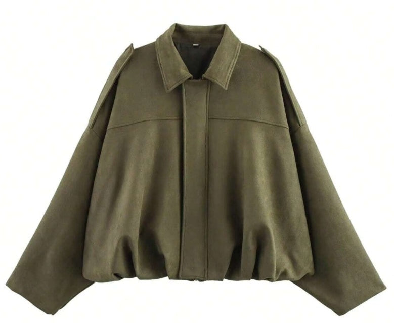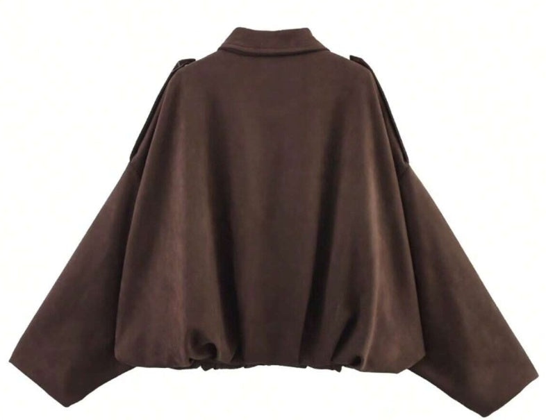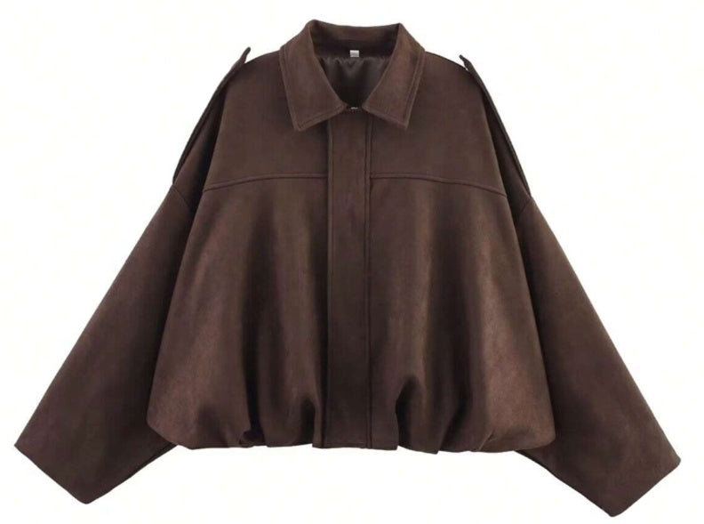 Denne oversizede brune jakke kombinerer komfort med et effortless streetstyle-look. Det bløde materiale føles varmt, mens den løse pasform giver et afslappet og moderne udtryk. Perfekt over en hoodie eller sweater på kølige efterårsdage – eller som et statement-piece i din vintergarderobe.